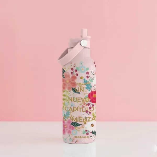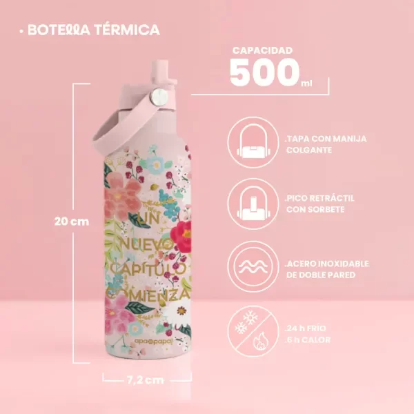 Disfrutá tus bebidas a la temperatura ideal durante todo el día. Esta botella térmica de 500 ml, hecha en acero inoxidable de doble pared, incluye tapa con manija colgante y pico retráctil con sorbete para tomar de forma práctica y cómoda.
