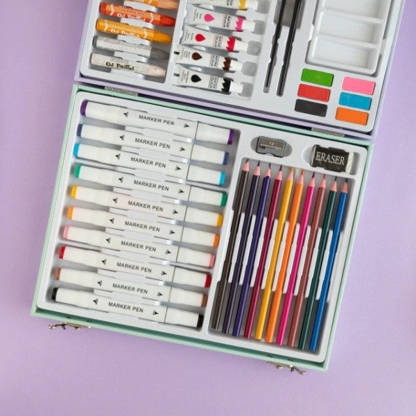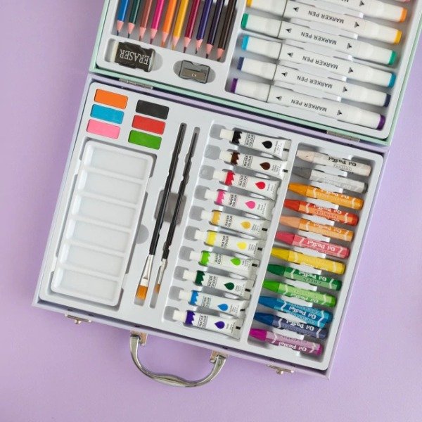 Incluye 52 piezas, para que no te falte nada a la hora de crear: Marcadores, Lápices, Crayones, Pinceles, acuarelas, goma de borrar, sacapuntas.