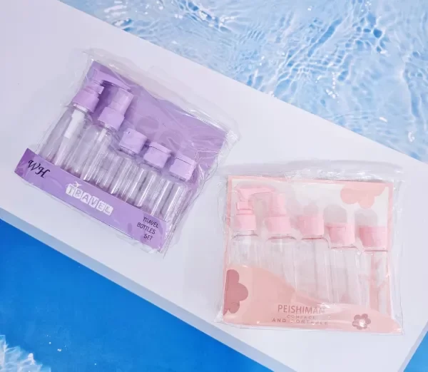 Set de Viaje "TRAVEL" dentro de la bolsa hay 3 botellas y 2 potes. Tiene 2 colores elegidos
