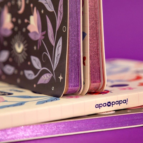 Tapa semi rígida, puntas redondeadas, terminación mate. Con elástico y cinta señaladora a tono.