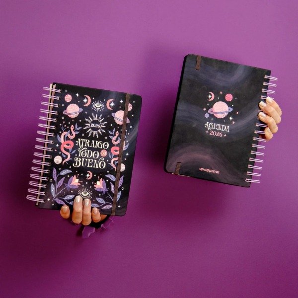 Tapa dura, puntas redondeadas, terminación soft touch mate y hot stamping a tono. Elástico y anillado super amplio y cómodo de colores!