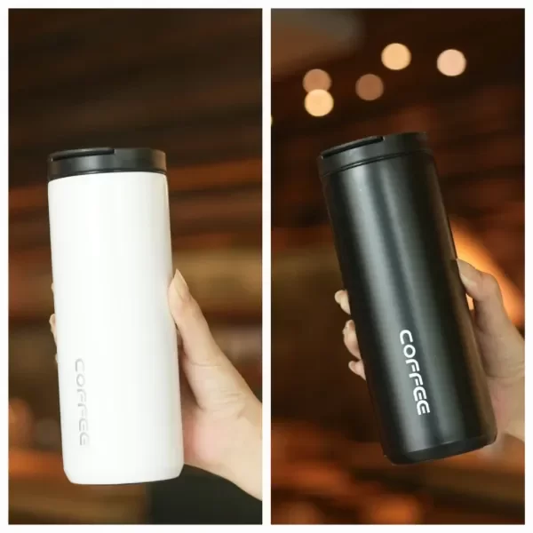 Vaso térmico de acero inoxidable cuenta con una tapa a rosca que lo protege de vuelcos y una tapa click para no permitir perder temperatura. Capacidad 550ml, apto para bebidas caliente y frías. Su base es de silicona antideslizante. Boquilla con tapa rebatible