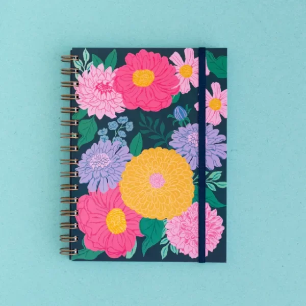 Cuaderno tamaño A5, tapa impresa en cartulina de 360gr, interior de 70 hojas rayadas en papel obra 80gr. Incluye elástico a tono.