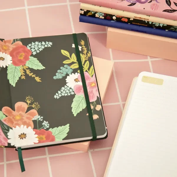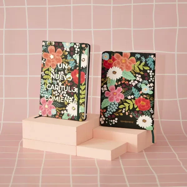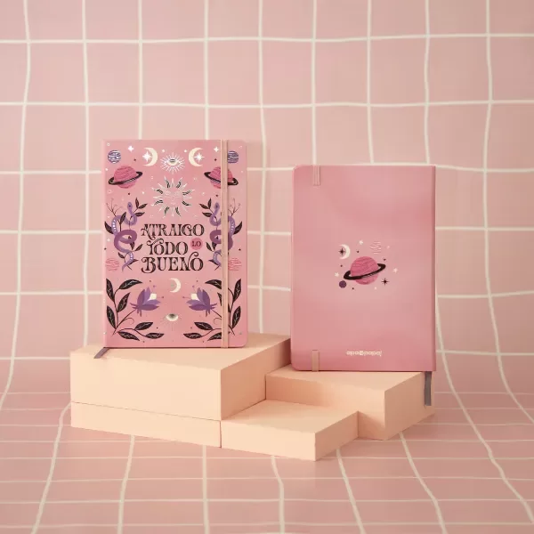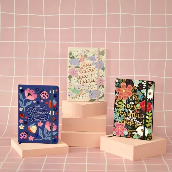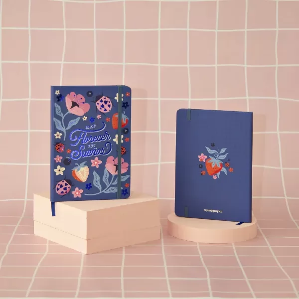 Son un sueño nuestros cuadernos lomo A5! Con terminación Soft Touch mate, hot stamping, Vienen con elástico, puntas redondeadas y tapa dura. Rallados, con sector para titulares y fecha. Con cinta señaladora a tono del diseño.