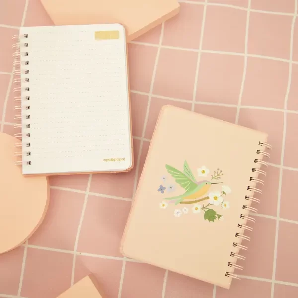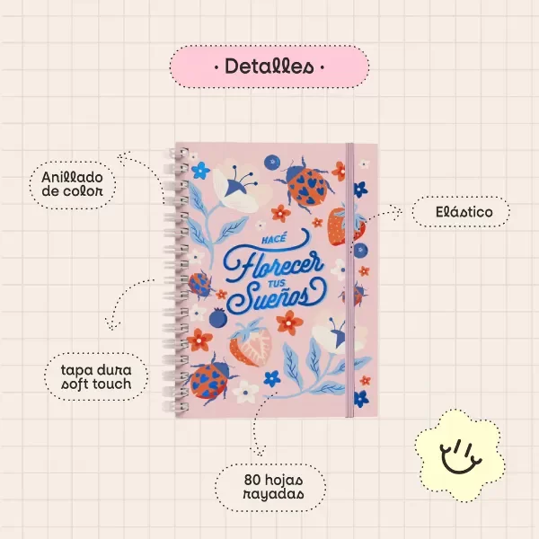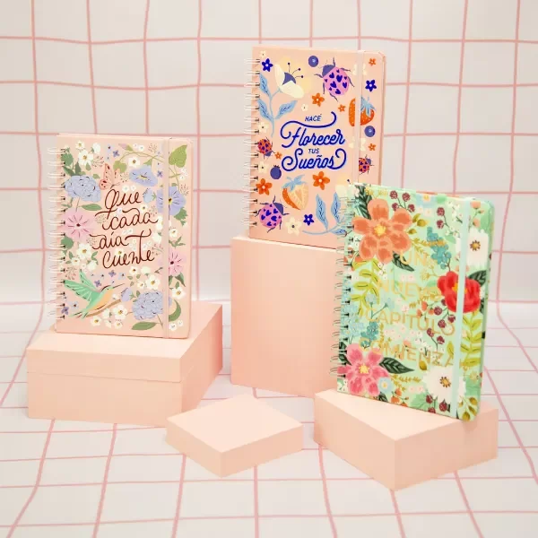 Nuestros cuadernos anillados A5 son un fuego! Con terminación mate Soft Touch, hot stamping, anillados a tono. Vienen con elástico, puntas redondeadas y tapa dura. Rallados, con sector para titulares y fecha.