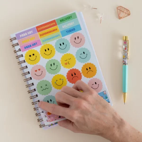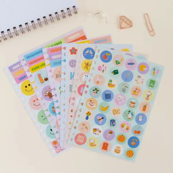 Set de 6 planchas de stickers encastrables. Son ideales para sumar color a las hojas! Como son encastrables se pueden agregar a cualquiera de nuestros cuadernos A5 o agendas.